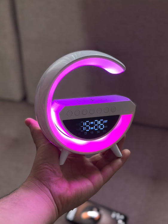 این محصول یک چراغ خواب، شارژر وایرلس، ساعت و اسپیکر قابل حمل به طول همزمان است که شمارا از خرید این محصولات به طلو جدا بی نیاز کرده و جای کمی را اشغال می کند. این محصول بسیار به صرفه بوده و دارای نورپردازی RGB با رنگ و طرح های مختلف، نمایشگر ساعت دیجیتال، کیفیت و شفافیت صدا و کلیدهای کنترل موسیقی همراه با قابلیت تنظیم ساعت و آلارم و شارژ بی سیم تلفن همراه است. قدرت شارژ این دستگاه 15 وات بوده و منبع تغذیه آن باتری قابل شارژ است