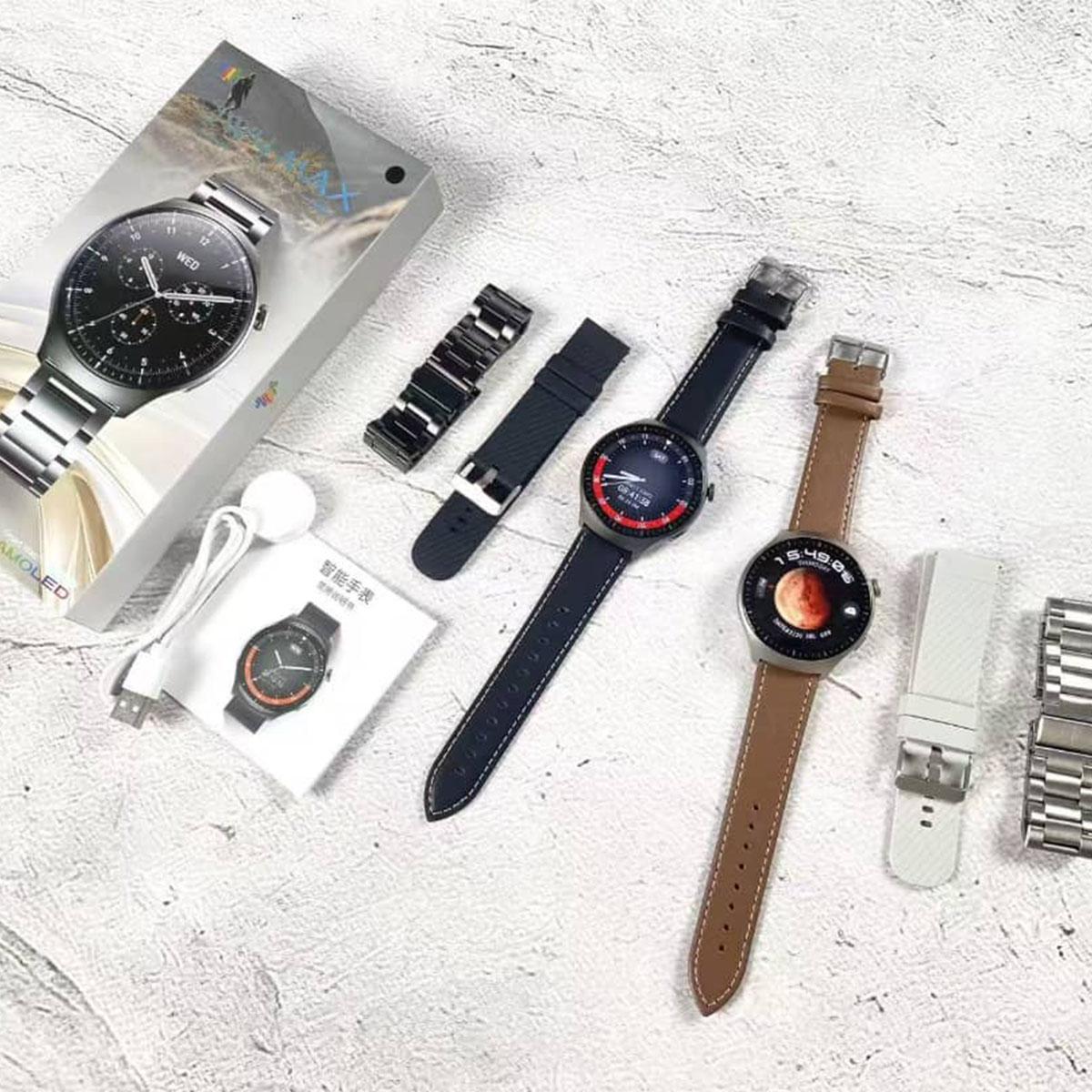در جعبه ساعت JW4 Max، یک دفترچه راهنما، کابل شارژ وایرلس و 3 بند متنوع (چرمی، رولکسی، سیلیکونی) قرار دارد که تجربه ای کامل و لوکس برای کاربر فراهم میکند.